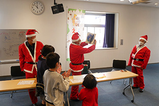 12/4(土)第16回は25世帯の方が来場。今月は3名のサンタクロースが大活躍!えがお企画では楽しいトークを交えながら手品を披露。バルーン風船やクリスマスツリー飾りも大人気でした。メニューはクリスマスらしい盛り付けの手づくりチキンライス。今月は会食スタイルで実施することができました。